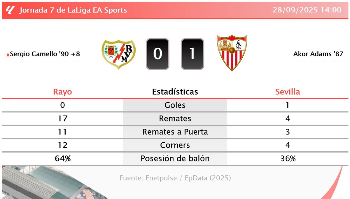 Rayo 0 - 1 Sevilla: resumen y estadísticas del partido de la jornada 7 de LaLiga EA Sports - EUROPA PRESS (2025)