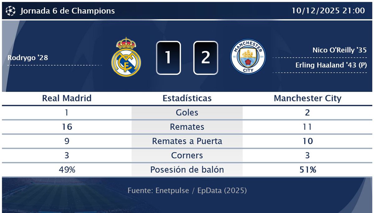 Real Madrid 1 - 2 Manchester City: resumen y estadísticas del partido de la jornada 6 de Champions - EUROPA PRESS (2025)