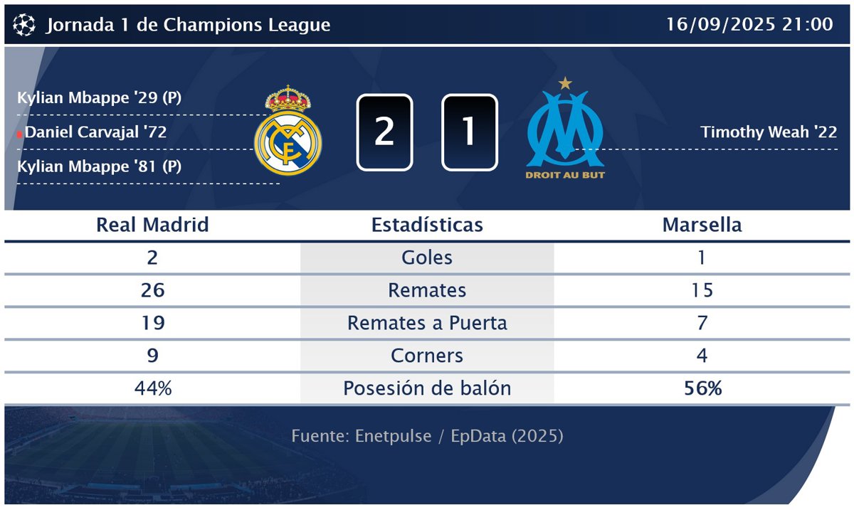 Real Madrid 2 - 1 Marsella: resumen y estadísticas del partido de la jornada 1 de Champions League - EUROPA PRESS (2025)