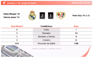 El Real Madrid venció este domingo por 2-1 al Rayo en un partido disputado en el Estadio Santiago Bernabéu con 74.170 espectadores. Los locales dominaron gran parte del encuentro con un juego ofensivo, materializando su superioridad con goles de Kylian Mbappé en el minuto 30 y Vinicius Junior en el minuto 34. Pedro Díaz recortó distancias para los visitantes en el tiempo añadido de la primera parte. Vinicius Junior fue el jugador más participativo en ataque, generando constante peligro y asistiendo a sus compañeros.