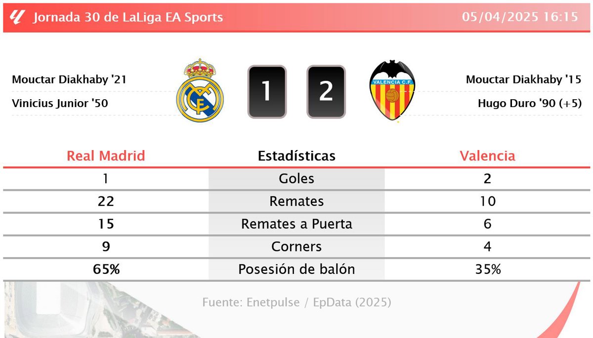 El Real Madrid cayó derrotado este domingo en el Santiago Bernabéu ante un Valencia que supo aprovechar sus ocasiones y sentenció el partido en los últimos minutos con un gol de Hugo Duro. El encuentro estuvo marcado por un penalti fallado por Vinicius Junior en el minuto 13 y un gol en propia puerta de Mouctar Diakhaby que posteriormente fue anulado por el VAR. Los locales dominaron claramente el partido con un 65% de posesión y 22 remates por los 10 del Valencia, pero la efectividad del equipo visitante fue determinante.