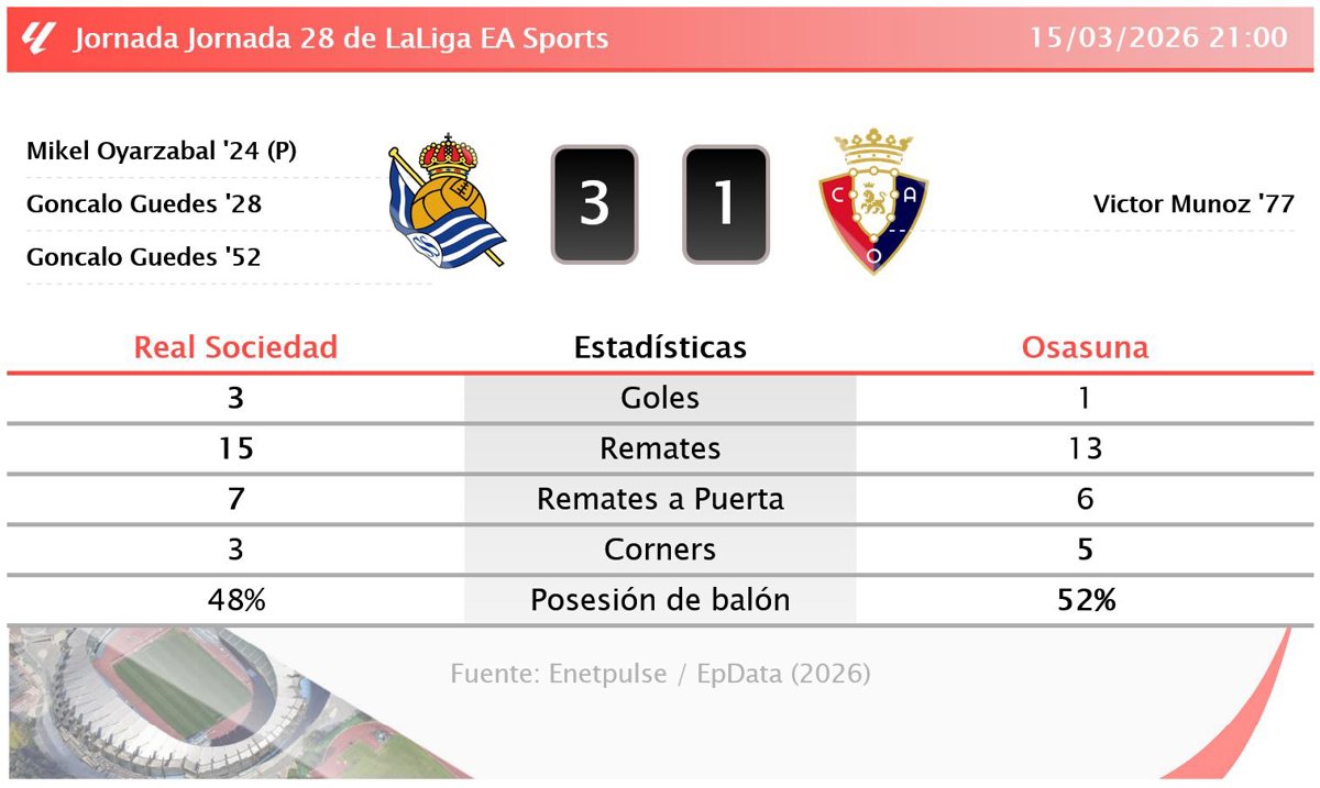 Real Sociedad 3 - 1 Osasuna: resumen y estadísticas del partido de la jornada 28 de LaLiga EA Sports - EUROPA PRESS (2026)