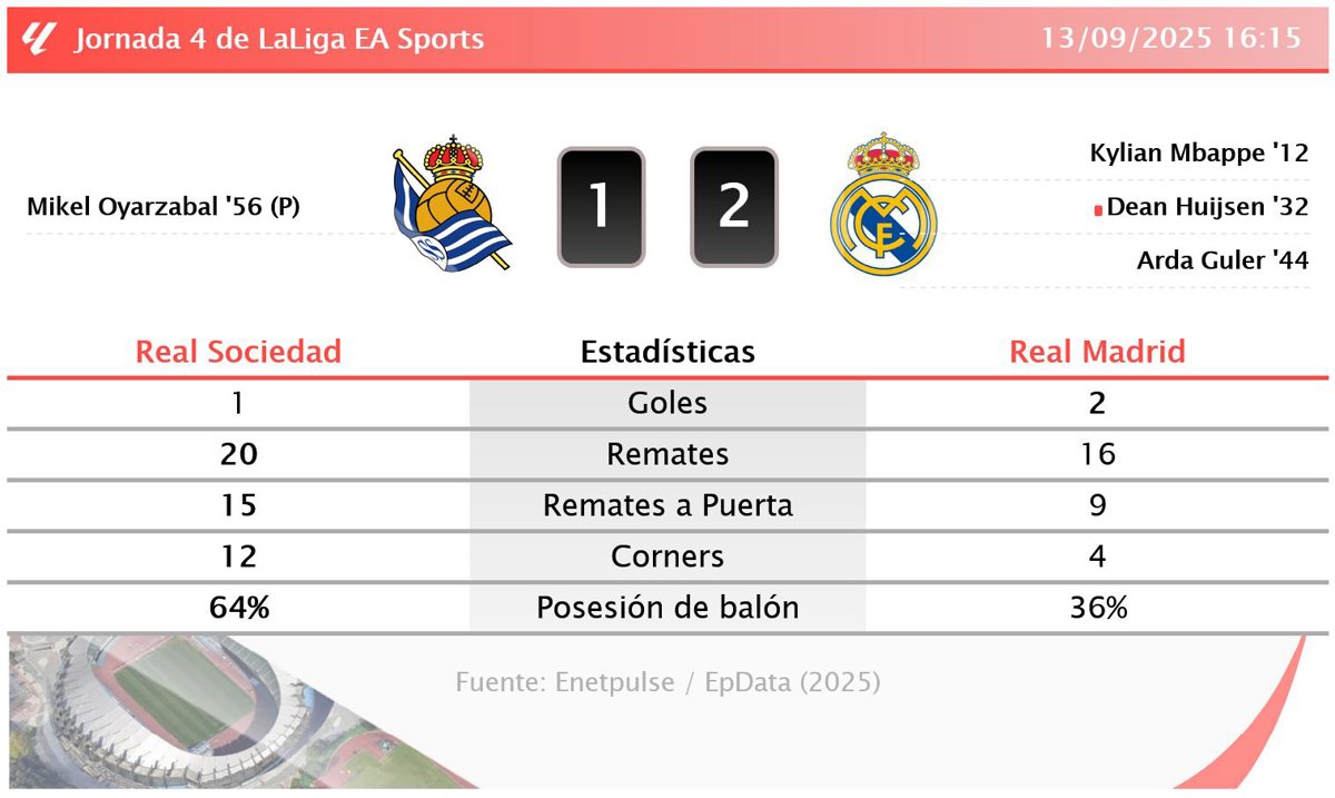 En el Reale Arena, el Real Madrid se impuso por 2-1 ante la Real Sociedad en un encuentro marcado por la intensidad y la disputa en el centro del campo. Los visitantes tomaron la delantera tempranamente gracias a un gol de Kylian Mbappe al minuto 12, seguido por otro tanto de Arda Guler asistido por Mbappe justo antes del descanso. La Real Sociedad redujo distancias en el marcador a través de un penalti convertido por Mikel Oyarzabal en el minuto 56. La expulsión de Dean Huijsen del Real Madrid en el minuto 32 tras una revisión del VAR por una falta grave añadió tensión al encuentro, pero no alteró el resultado final.