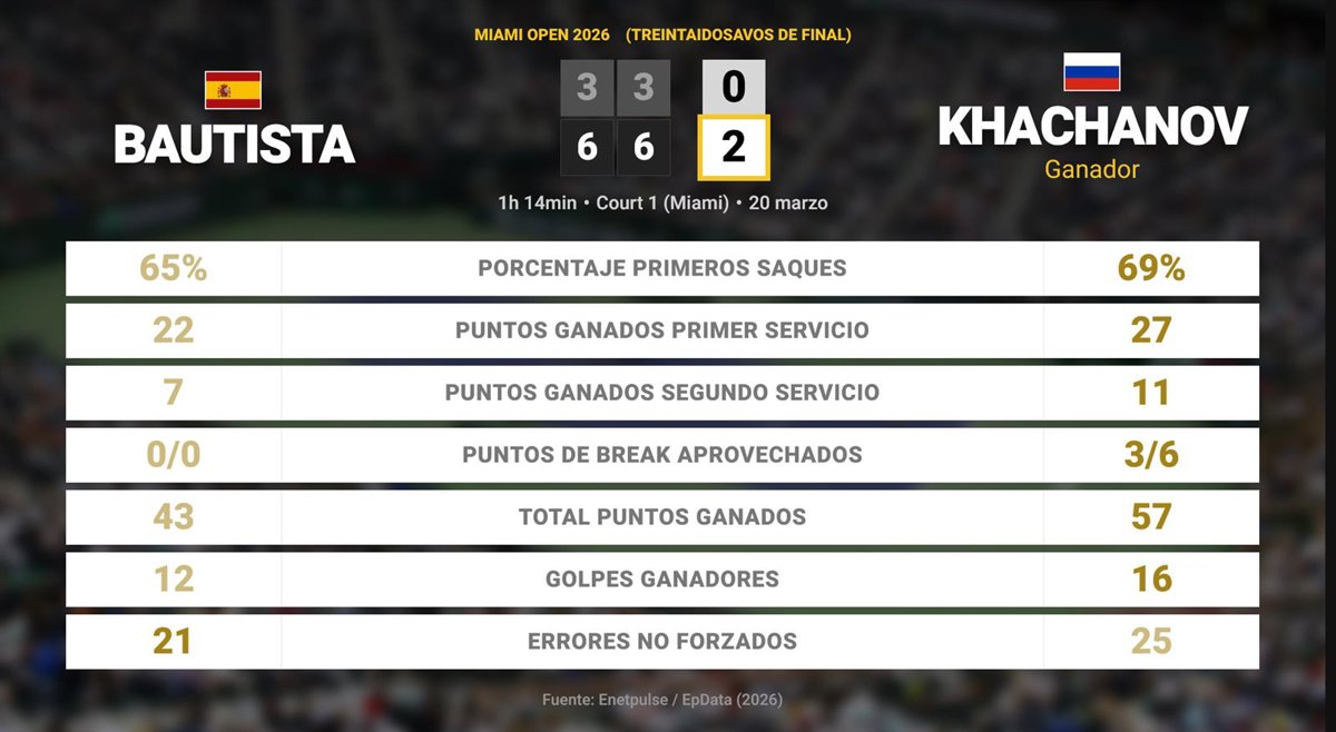 Roberto Bautista Agut 0 - 2 Karen Khachanov: resumen y estadísticas del partido de Miami Open (ATP) - EUROPA PRESS (2026)