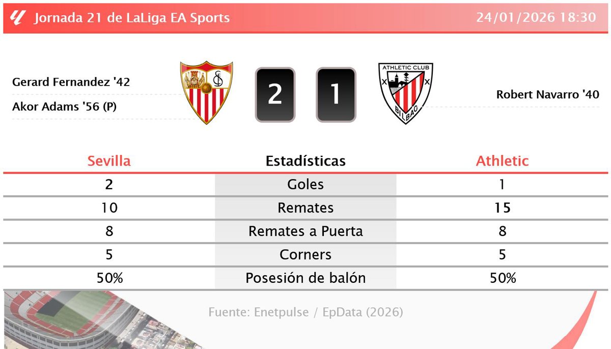Sevilla 2 - 1 Athletic: resumen y estadísticas del partido de la jornada 21 de LaLiga EA Sports - EUROPA PRESS (2026)