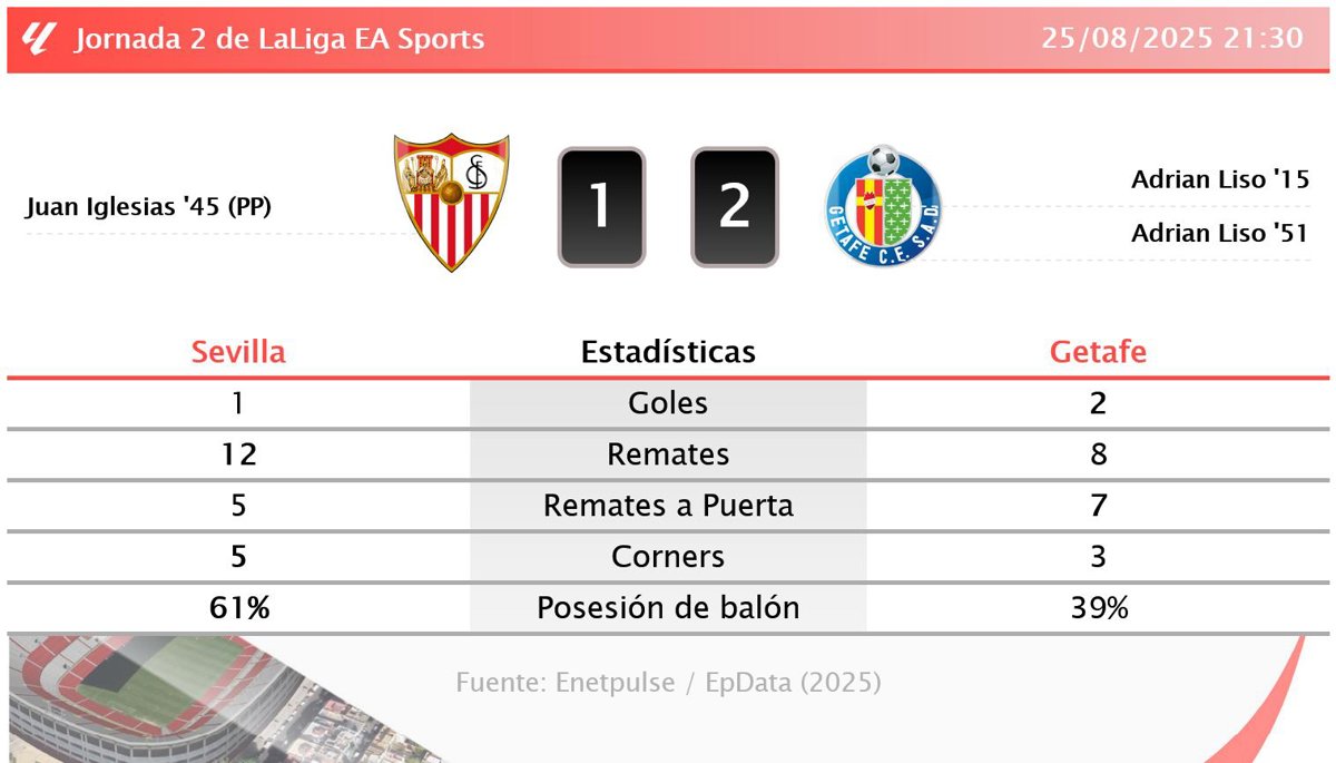 Sevilla 1 - 2 Getafe: resumen y estadísticas del partido de la jornada 2 de LaLiga EA Sports - EUROPA PRESS (2025)