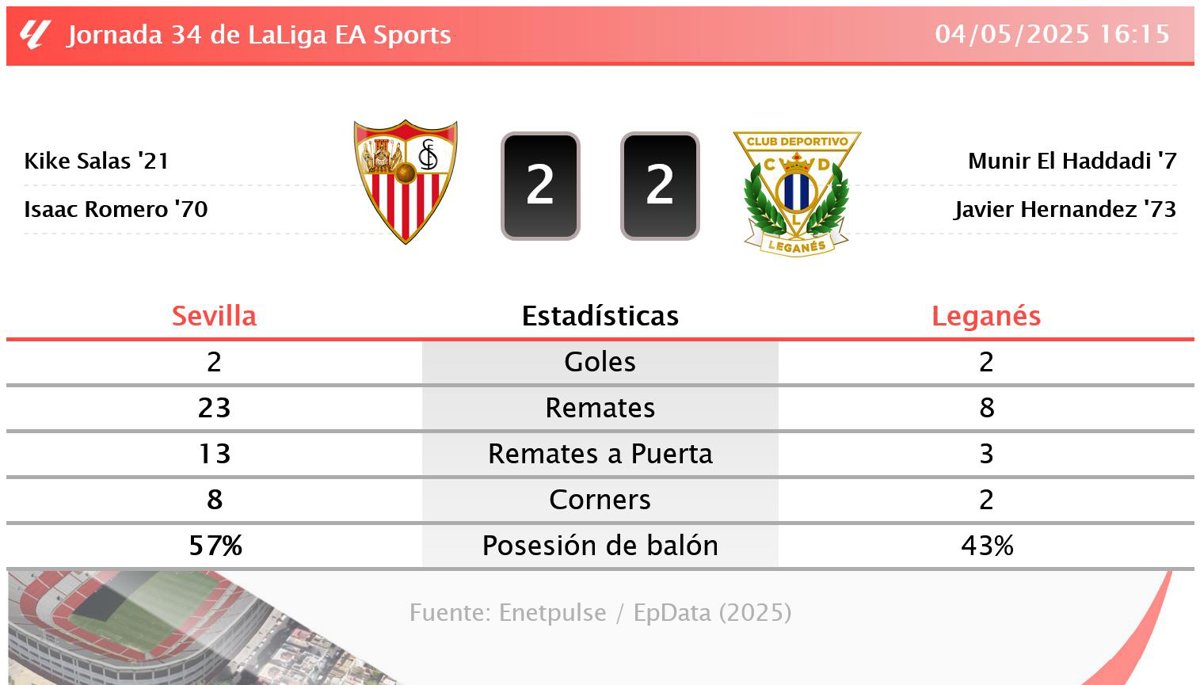 Sevilla 2 - 2 Leganés: resumen y estadísticas del partido de la jornada 34 de LaLiga EA Sports - EUROPA PRESS (2025)