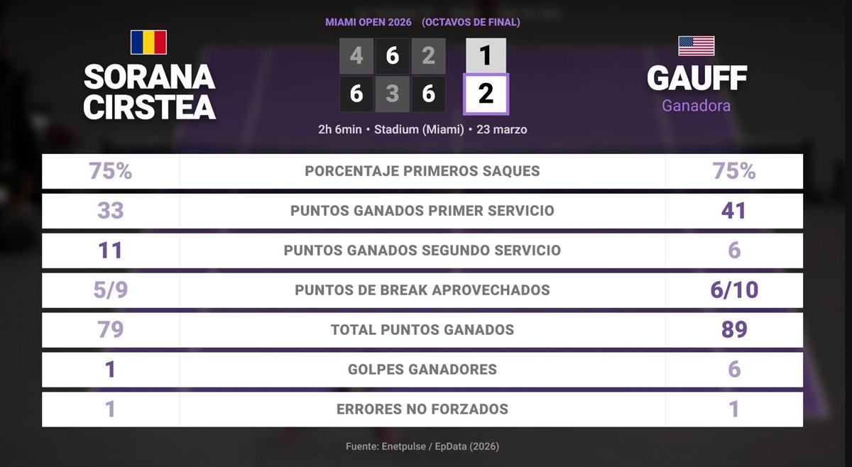 Sorana Cirstea 1 - 2 Coco Gauff: resumen y estadísticas del partido de Miami Open (WTA) - EUROPA PRESS (2026)