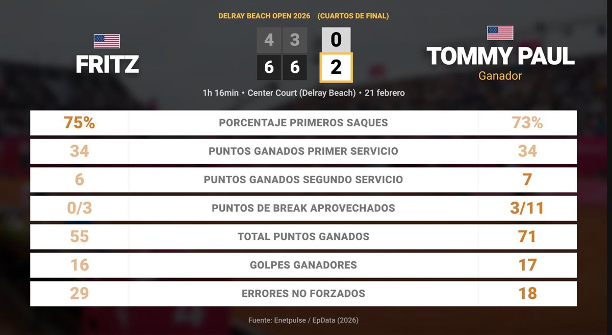 Taylor Fritz 0 - 2 Tommy Paul: resumen y estadísticas del partido de Delray Beach Open (ATP) - EUROPA PRESS (2026)