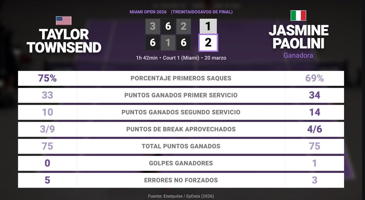 Taylor Townsend 1 - 2 Jasmine Paolini: resumen y estadísticas del partido de Miami Open (WTA) - EUROPA PRESS (2026)