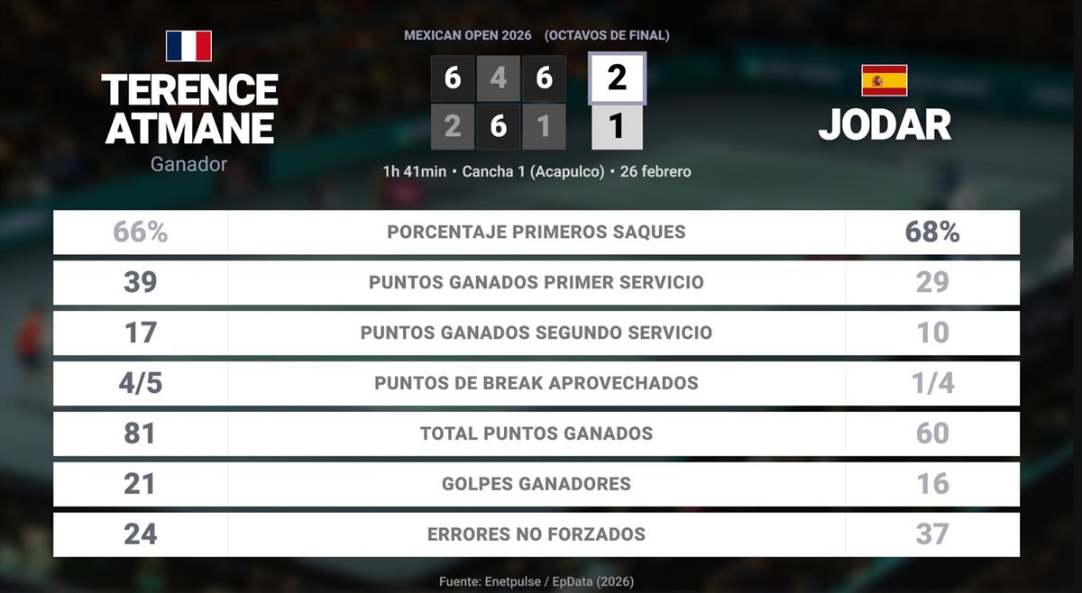Terence Atmane 2 - 1 Rafael Jodar: resumen y estadísticas del partido de Mexican Open (ATP) - EUROPA PRESS (2026)