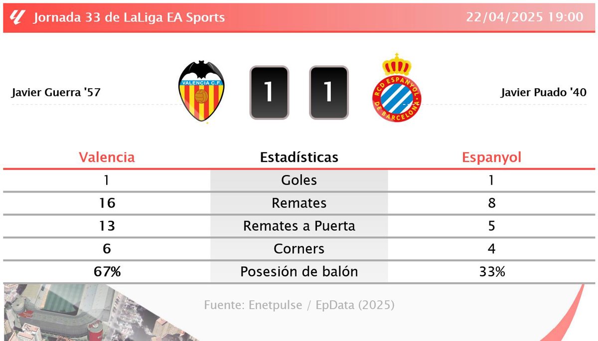 El Valencia empató este martes ante el Espanyol en un partido disputado en el Estadio Mestalla con un resultado de 1-1, donde los locales mostraron mayor dominio con un 67% de posesión y 16 remates por los 8 de los visitantes. Javier Guerra, con un gol en el minuto 57 asistido por Luis Rioja, logró la igualada después de que Javier Puado adelantara al Espanyol en el minuto 40 con asistencia de Edu Exposito.