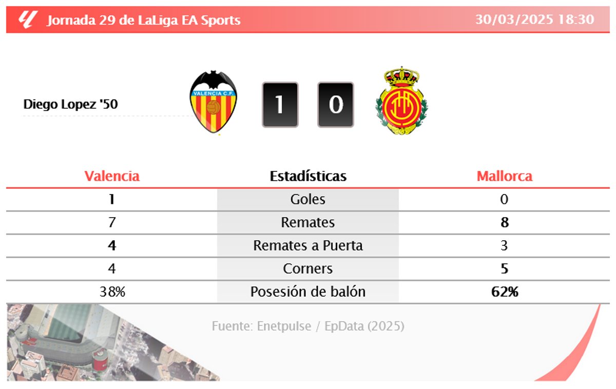 Valencia 1 - 0 Mallorca: resumen y estadísticas del partido de la jornada 29 de LaLiga EA Sports - ENETPULSE / EPDATA (2025)