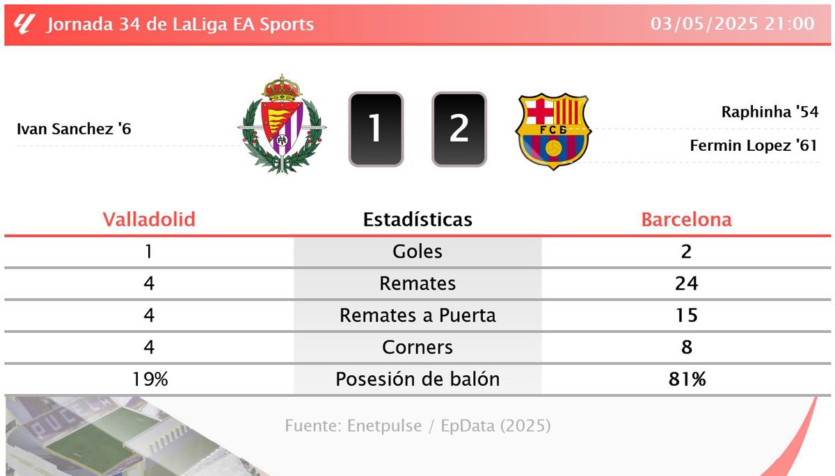 Valladolid 1 - 2 Barcelona: resumen y estadísticas del partido de la jornada 34 de LaLiga EA Sports - EUROPA PRESS (2025)