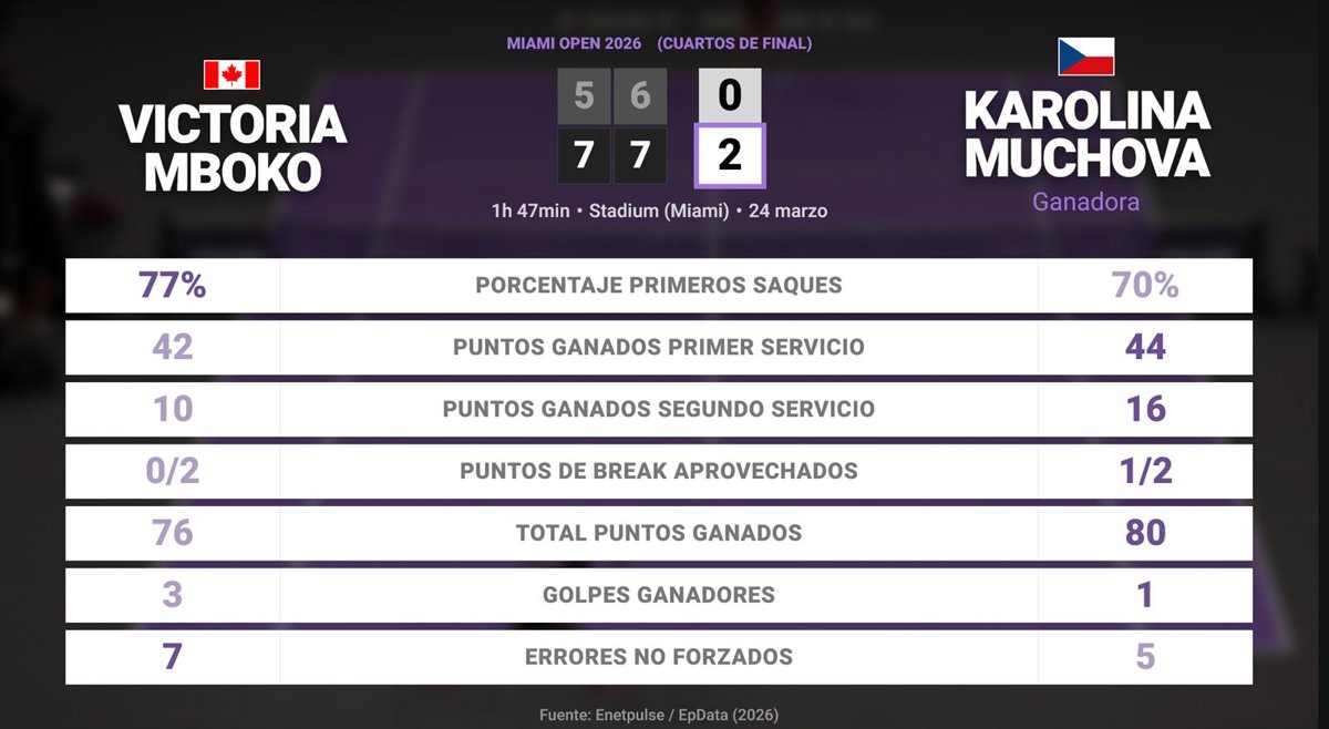 Victoria Mboko 0 - 2 Karolina Muchova: resumen y estadísticas del partido de Miami Open (WTA) - EUROPA PRESS (2026)