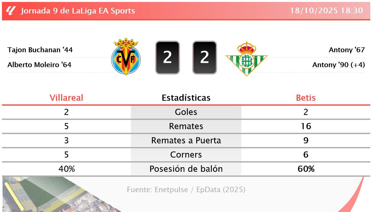 Villareal 2 - 2 Betis: resumen y estadísticas del partido de la jornada 9 de LaLiga EA Sports - EUROPA PRESS (2025)