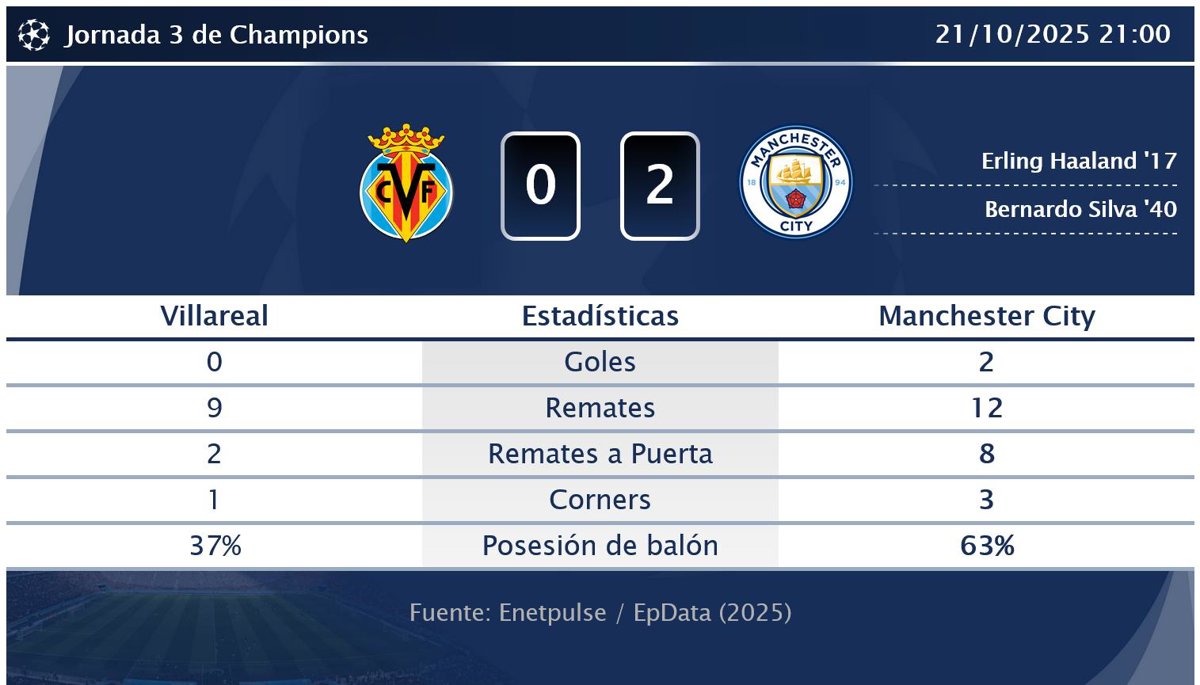 El Manchester City ha ganado este martes por 2-0 al Villarreal en el primer partido de la jornada 14 en Champions, aprovechando los azulones tras el descanso la fragilidad defensiva de su adversario. Erling Haaland abrió el marcador en el minuto 17 con asistencia de Rico Lewis, y Bernardo Silva amplió la ventaja en el 40 con pase de Savinho. El Villarreal no pudo reaccionar y el Manchester City se impuso con autoridad, mostrándose como el equipo más participativo y activo en ataque a lo largo del encuentro.
