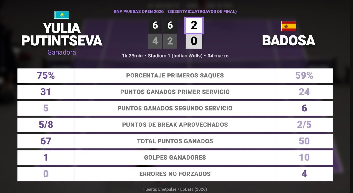 Yulia Putintseva 2 - 0 Paula Badosa: resumen y estadísticas del partido de BNP Paribas Open (WTA) - EUROPA PRESS (2026)