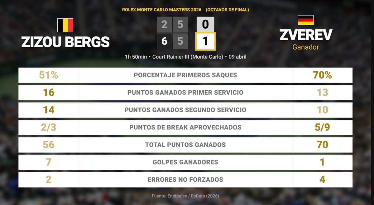 Zizou Bergs 0 - 2 Alexander Zverev: resumen y estadísticas del partido de Rolex Monte Carlo Masters (ATP) - EUROPA PRESS (2026)