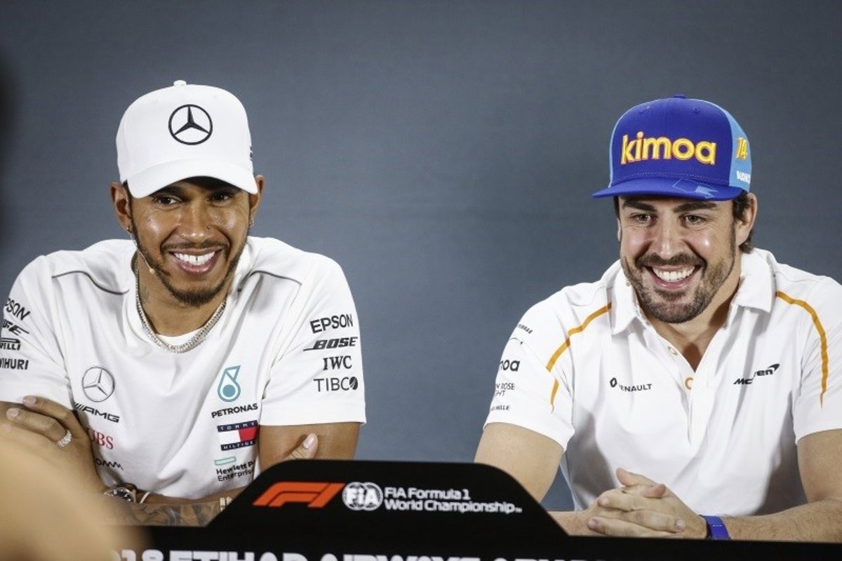 Fernando Alonso se ríe junto a Lewis Hamilton - DPPI/AFP7 - Archivo