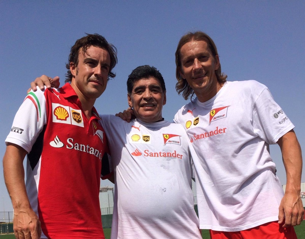 El piloto español Fernando Alonso (Ferrari) ha completado un entrenamiento excepcional en Dubai, donde se ha ejercitado con exfutbolistas como Diego Armando Maradona, Michel Salgado, Alfonso Pérez y Patxi Salinas.