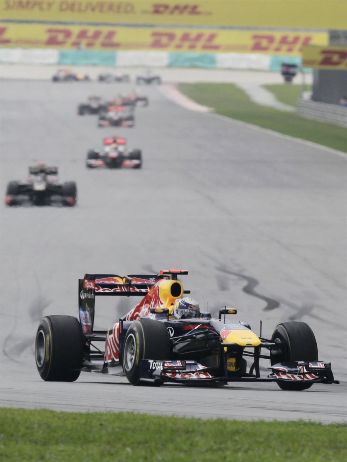 El piloto alemán Sebastian Vettel (Red Bull) se ha adjudicado la victoria en el Gran Premio de Malasia, segundo de la temporada, en la que el español Fernando Alonso (Ferrari) terminó en sexta posición después de una mala salida que consiguió remontar durante la carrera, pero un choque con Lewis Hamilton (McLaren-Mercedes), que le rompió el alerón delantero, le privó del podio.