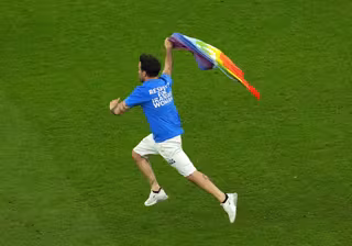 Aunque la retransmisión del partido apenas pudo captar el momento, fue posible ver brevemente a alguien corriendo por el campo con esta bandera, que también llevaba la palabra 'Paz' y que, según se aclaró posteriormente en varios medios, es diferente a la del movimiento LGTBIQ+. Las fotos publicadas en las redes sociales también mostraron que la parte delantera de la camiseta del aficionado decía 'Salvemos a Ucrania' y la parte de atrás decía 'Respeto a las mujeres iraníes'.