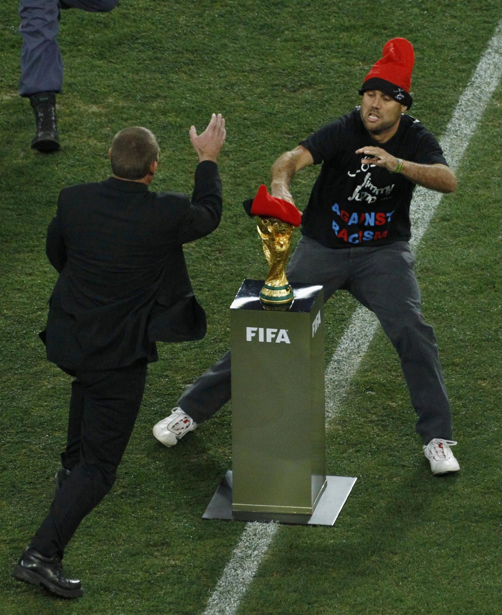 Jimmy Jump, que también saltó al escenario de Eurovisión durante el mes de mayo mientras participaba España, saltó al césped con la intención de ponerle la barretina al trofeo del Mundial. Tras burlar las medidas de seguridad, consiguió su objetivo, pero rápidamente fue detenido por los vigilantes del campo.