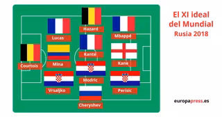 Una vez concluido el Mundial de Rusia toca elegir el mejor once de jugadores tras un mes de competición. En Europa Press Deportes hemos elaborado este, con la base de las dos finalistas, y bajo el esquema del 3-4-3.