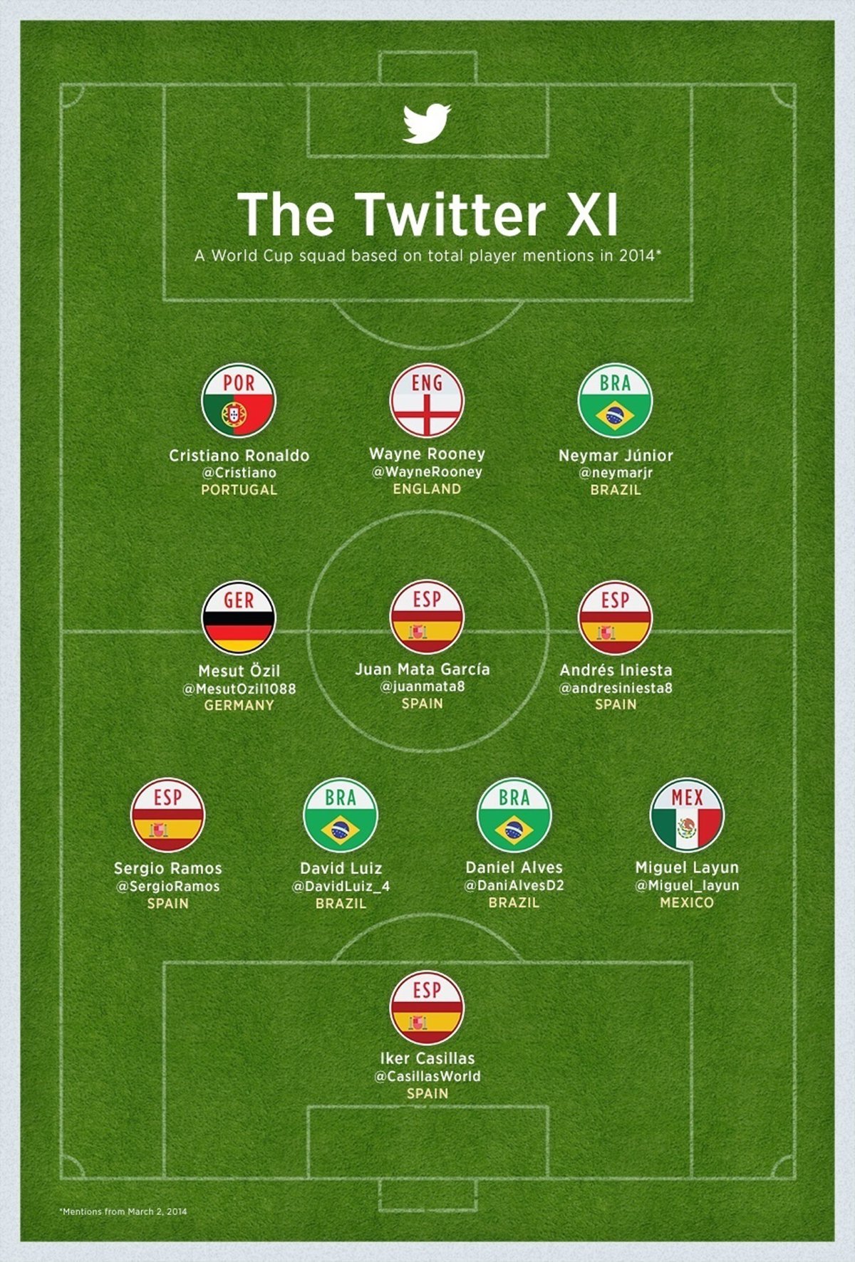 España, con Íker Casillas, Sergio Ramos, Juan Mata y Andrés Iniesta, supera a Brasil, con David Luiz, Dani Alves y Neymar júnior, mientras que el mexicano Miguel Layun, el alemán Mesut Ozil, el portugués Cristiano Ronaldo y el inglés Wayne Rooney completan este 'once' de jugadores más nombrados en la red social.