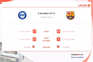 En el apartado ofensivo, el conjunto azulgrana supera al 'glorioso' en goles por partido con 3,1 goles por encuentro del primero frente a 1,4 del segundo. En cuanto a la calidad de las ocasiones de gol generadas, los catalanes también aventajan a los vitorianos con 2,1 goles esperados frente a 0,8, según las estadísticas de Driblab consultadas por Europa Press.