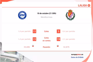De media, el Alavés ha recibido 1,7 goles y 9,4 disparos por partido, frente a los 2,1 goles y 8,3 remates que recibe el Valladolid.