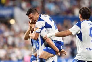 Alberto Zapater celebra un gol con sus compañeros del Real Zaragoza. - LALIGA