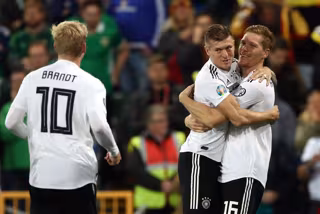 09 September 2019, Northern Ireland, Belfast: Germany's Marcel Halstenberg (R) celebrates scoring his side's first goal with his team mates Julian Brandt (L) and Toni Kroos during the UEFAEURO 2020 qualifiers Group C soccer match between Northern Irela - Christian Charisius/dpa