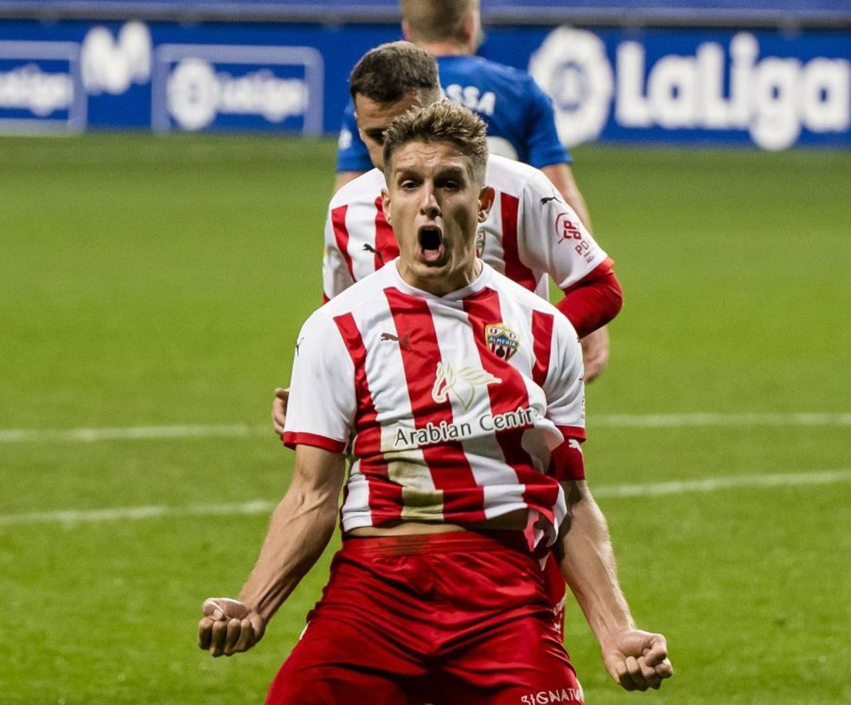 Corpas celebra el 0-1 del Almería ante el Oviedo en LaLiga SmartBank 2020-2021 - PRENSA LALIGA