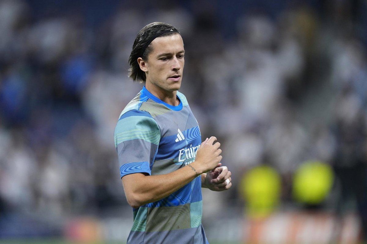 El lateral izquierdo español Álvaro Carreras, en un calentamiento del Real Madrid CF ante el Olympique de Marsella de la Champions 2025-26 en el Estadio Santiago Bernabéu. - Oscar J. Barroso / AFP7 / Europa Press