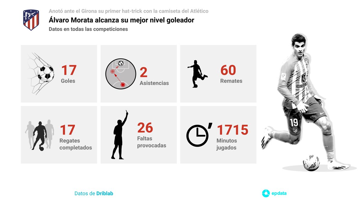 El internacional español vivió en Montilivi una de las mejores noches a nivel individual de su carrera. Morata fue el autor de los tres goles conseguidos por su equipo, un hito empañado por la derrota sufrida ante el Girona (4-3) en un encuentro en el que además vio como el VAR le anulaba otro gol por fuera de juego. En total, el delantero madrileño remató en seis ocasiones ante el marco de Paulo Gazzaniga, generando 1,5 goles esperados.