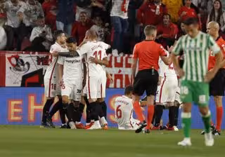Los jugadores del Sevilla celebran un gol en el partido ante el Betis de LaLiga Santander 2018-2019 - LALIGA - Archivo