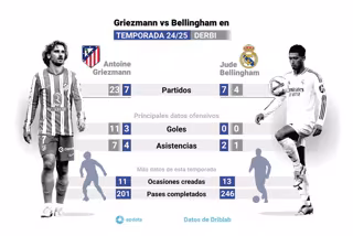 En cuanto al rendimiento de ambos jugadores en los derbis madrileños, ahí Griezmann se lleva el duelo. En los duelos capitalinos en los que ambos han coincidido --los cuatro de la pasada temporada-- el francés anotó tres goles y repartió una asistencia, quedándose tan solo en el partido de Liga del Bernabéu sin participar en un tanto colchonero. Por su parte, Bellingham no rindió a buen nivel ante los rojiblancos y solo pudo dar una asistencia en la derrota copera.