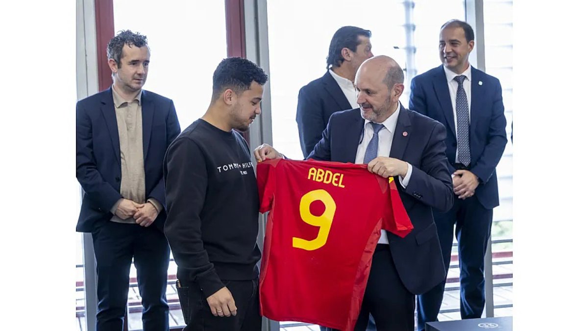 En la visita, el presidente de la RFEF, Rafael Louzán, entregó una camiseta personalizada de la selección española al joven árbitro nacido en Guadalajara.