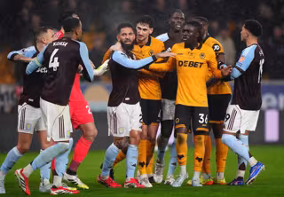 27 February 2026, United Kingdom, Wolverhampton: Tensions flare between the players during the English Premier League soccer match between Wolverhampton Wanderers and Aston Villa at Molineux Stadium. Photo: Bradley Collyer/PA Wire/dpa - Bradley Collyer/PA Wire/dpa