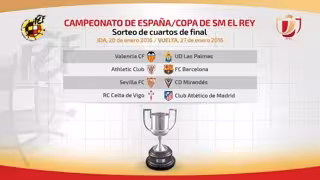 El sorteo de cuartos de final de la Copa del Rey ha deparado este viernes la reedición de la última final entre los dos equipos más laureados de la historia del torneo, Athletic Club y Barcelona, mientras que Atlético de Madrid y Valencia parten como favoritos ante Celta y Las Palmas, respectivamente, y el Mirandés, único superviviente de la Liga Adelante, intentará prolongar su sueño copero ante el Sevilla.