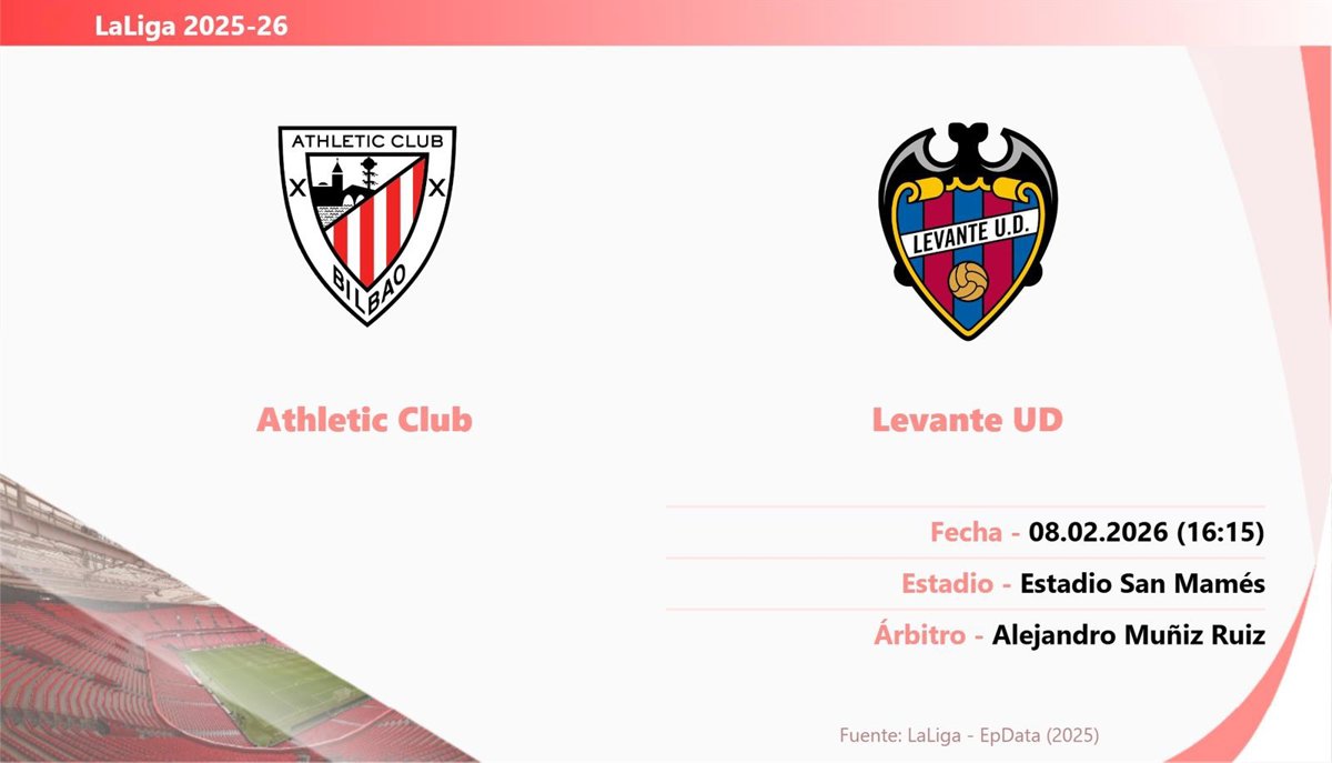 El partido que enfrenta a Athletic Club y Levante de la jornada 23 de LaLiga EA Sports 2025-26 se disputará el domingo 8 de enero a las 16.15 horas en San Mamés.