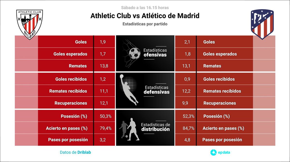 En el apartado ofensivo, el Atlético tiene mejores números que el Athletic Club en goles por partido, con 2,1 goles por encuentro del primero frente a 1,9 del segundo. En cuanto a la calidad de las ocasiones de gol generadas, el Atlético también supera al Athletic con 1,7 goles esperados frente a 1,8, según las estadísticas de Driblab consultadas por Europa Press.