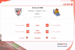 En el apartado ofensivo, el equipo vizcaíno mejora los registros de los donostiarras en goles por partido con 1,5 goles por encuentro del primero frente a 0,8 del segundo, según las estadísticas de Driblab consultadas por Europa Press. En cuanto a la calidad de las ocasiones de gol generadas, ambos tienen un registro similar con 1 goles esperados.