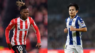 El jugador del Athletic Club Nico Williams y el de la Real Sociedad Take Kubo. - EUROPA PRESS