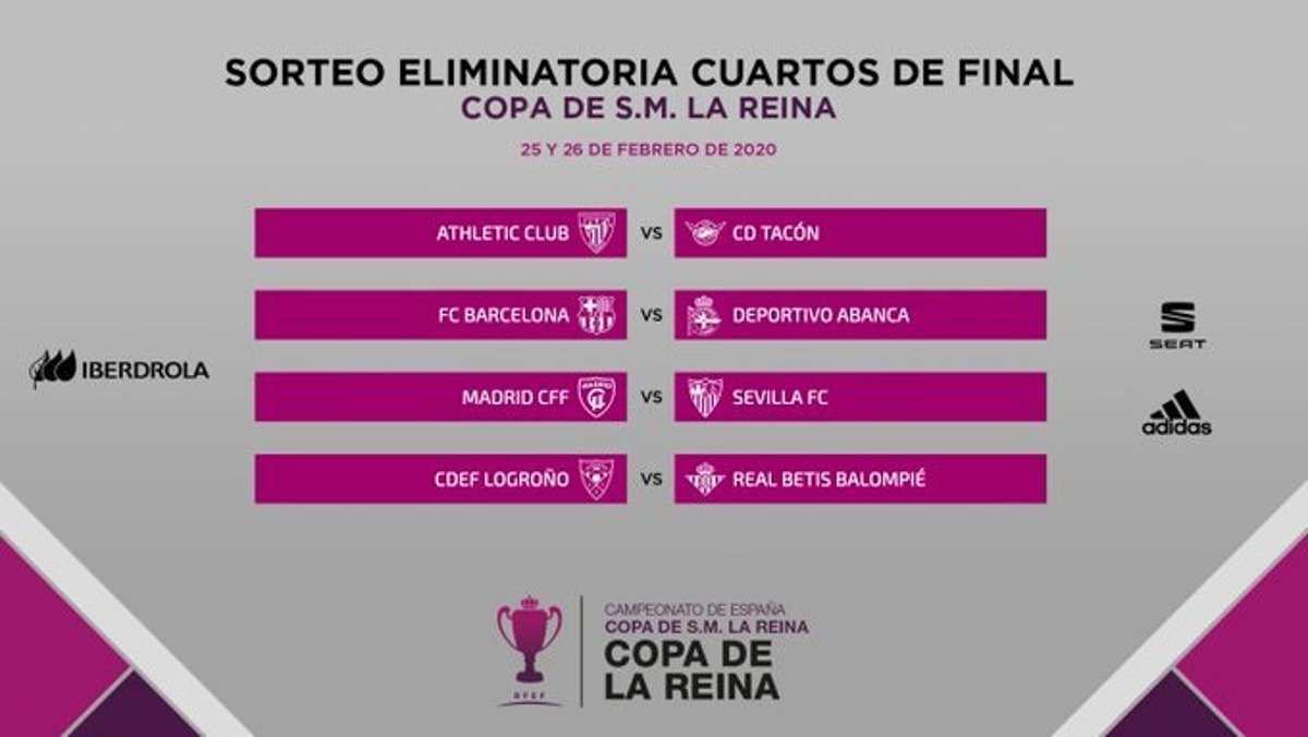 Athletic Club-CD Tacón, FC Barcelona-RC Deportivo ABANCA, Madrid CFF-Sevilla FC y EDF Logroño-Real Betis Balompié serán las eliminatorias de cuartos de final de la Copa de la Reina de fútbol, según ha deparado el sorteo celebrado este viernes en la Ciudad del Fútbol de Las Rozas (Madrid).