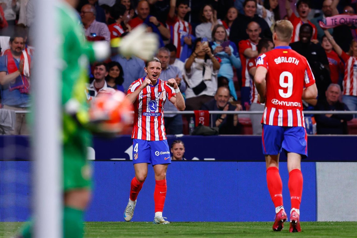 En el Riyadh Air Metropolitano, los locales tardaron tres minutos en abrir el marcador. Marcos Llorente avanzó por la banda derecha y pasó a Giuliano Simeone, que casi desde la línea de fondo centró bombeado al segundo palo, donde Sorloth ganó por fuerza el salto al central Florian Lejeune y cabeceó el 1-0, estando desubicado el portero Augusto Batalla.