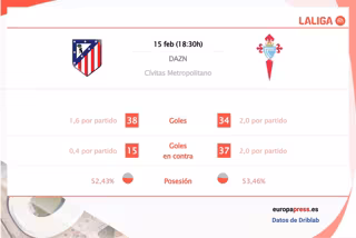 De media, el Atlético de Madrid ha encajado 0,7 goles y 11,7 disparos por partido por los 1,6 goles y 10 disparos que recibe el Celta de Vigo.