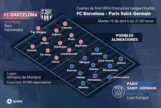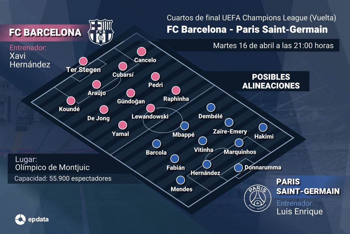 El técnico blaugrana, que en la previa de este duelo se mostró "plenamente convencido" de que su equipo iba a darle la vuelta al 2-3 y que no especularía nada, recupera a Achraf Hakimi (sancionado en la ida) y tiene ya en plena forma al rápido extremo Barcola, que junto a Dembélé y Mbappé formarán casi seguro una tripleta ofensiva de aúpa. Nueva prueba para Araujo, Cubarsí (se salió en París) y compañía.